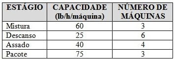 – A capacidade global da padaria é 150 libras por hora, a qual é determinada pela operação de descanso, estágio que possui a menor capacidade.