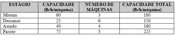 Desta forma, a capacidade total da padaria é determinada através do cálculo da capacidade total de cada estágio do processo, conforme vemos a seguir: