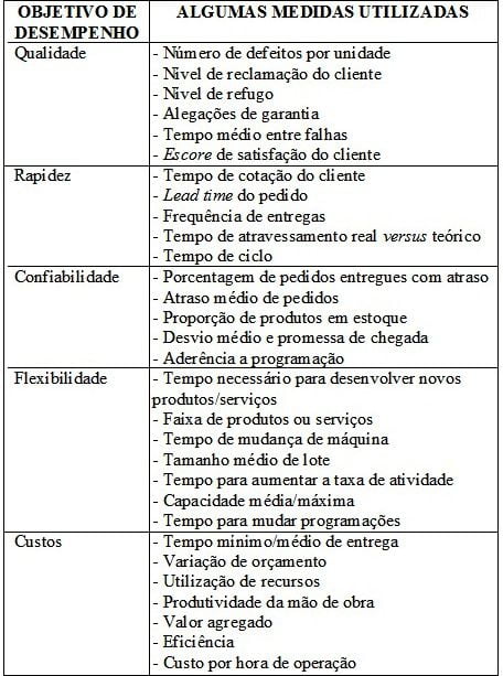Medida de desempenho é o processo de quantificar a ação, onde medida significa o processo de quantificação e o desempenho da produção é presumido como derivado de ações tomadas por sua administração. O desempenho é definido como o grau em que a produção preenche os cinco objetivos de desempenho (qualidade, rapidez, confiabilidade, flexibilidade e custos), de forma a satisfazer seus consumidores.