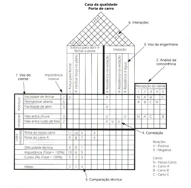 – Comparação técnica: a porta de nosso carro necessita da maior força para fechar (11) ao passo que a porta do carro ?A? necessitada de 9 (os valores devem ser expressos nas unidades de medidas de força). A dificuldade técnica para essa característica ser melhorada é 4, em um máximo de dificuldade técnica de valor 5. A importância dada pelo consumidor quanto a essa característica da engenharia é 10% (a soma das porcentagens de todas as características deve ser igual a 100%). Os custos em % indicam a importância relativa. As metas identificam os valores que devem ser atingidos para a característica da engenharia. Assim, a força para fechar deverá ser de 7, e não mais de 11 na modificação a ser realizada.