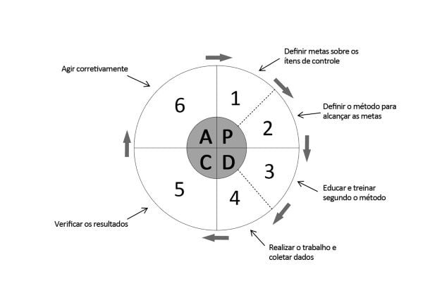Na etapa inicial, planeje uma meta e um plano de ação para atingi-la. Execute a ação conforme a nova diretriz e verifique se atingiu a meta. Se atingir os objetivos, padronize a nova sistemática de ação; se não atingir a meta, retorne à etapa inicial e planeje um novo método, elaborando um novo plano de ação.