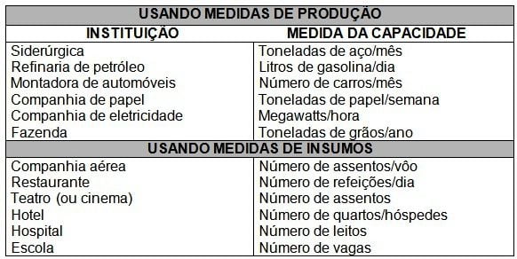 A capacidade pode ser medida como toneladas de alumínio por dia ou ano, números de veículos por dia ou ano, numero de clientes atendidos por mês, numero de lugares disponíveis por dia (em aviões, por exemplo), etc. Não devemos nos esquecer que a capacidade está relacionada ao tempo.