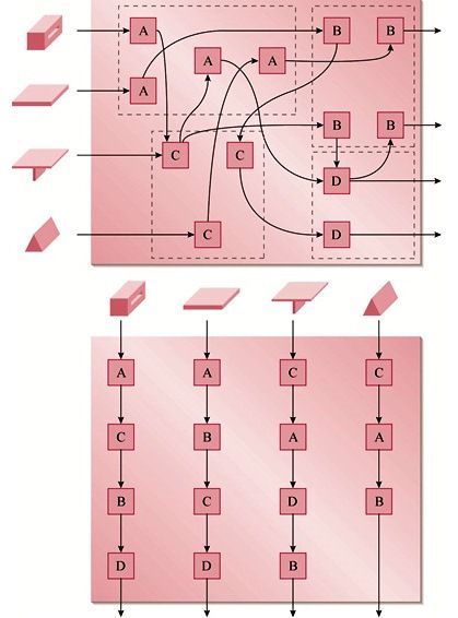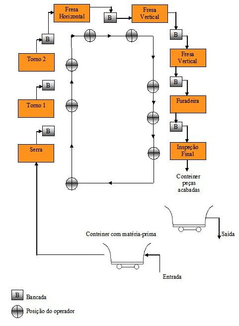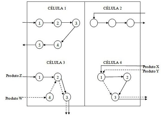 As figuras a seguir apresentam exemplos esquemáticos de células. Lembrando que os conceitos de células de manufatura decorrem das teorias da tecnologia de grupo.